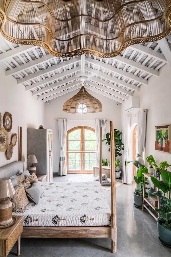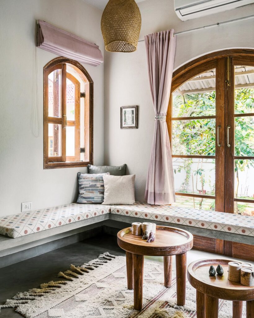 Huge arched windows and doors, Juliet balconies, a large verandah and balcao, and the original Mangalore tile-and-wood roof are all characteristics of the home. The owners’ own statement lights are intended to give your experience a “larger-than-life” quality. The interior has an irreplaceably earthy feel thanks to the tumbled stone floors. However, the living room really is the best. Amger is reminiscent of an art collector’s home with its wicker wall art, crochet couches, and raffia decor. The living area also contains treasures from the owners’ travels.