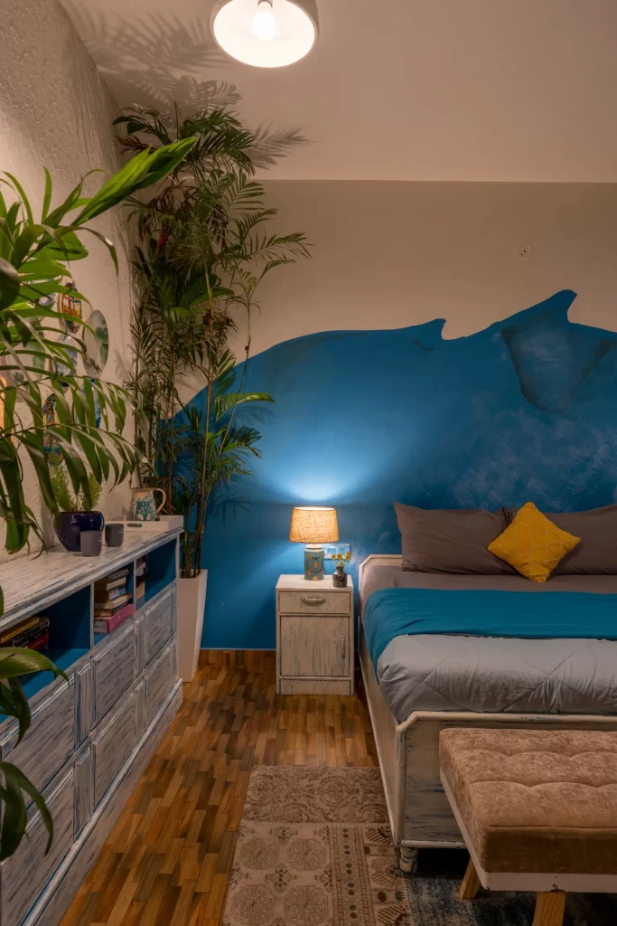 With its shades of yellow, blue, and violet, the second room has a hint of Rajasthani design thanks to its mirrors, jhoola (swing), and floral wall decorations. Large families frequently use this area, therefore to ensure that everyone has their privacy, a wooden staircase connects to the attic.