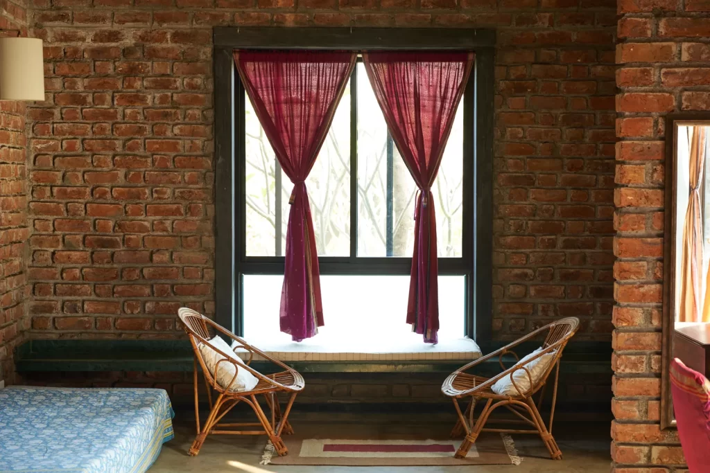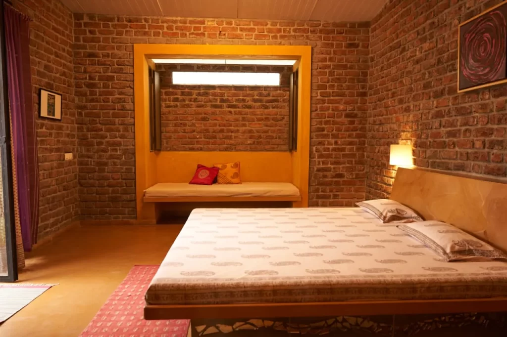 The interiors are stone and wood, with exposed brick walls and potted plants for pops of green, and there are outdoor spaces to lounge in. Two guest rooms come with air conditioners, and the Parekhs find they are best used for afternoon naps and are not required at night, when the weather remains fairly pleasant most times of the year, given the green cover around the house. Guests can access the common living rooms and outdoor areas, as well as the garden, which is great for spotting birds.